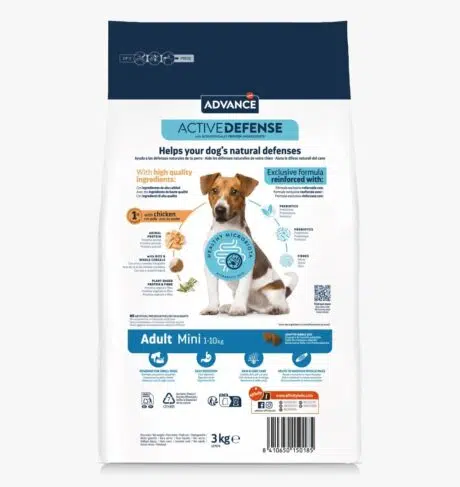 ADVANCE Adult Mini es un alimento de alta gama fácil de digerir formulado para cubrir sus necesidades específicas. Facilita el correcto funcionamiento del sistema inmunitario y las barreras naturales y les ayuda a mantener una masa muscular óptima, la salud dental e intestinal, la piel sana y el pelo brillante. Además, el tamaño de las croquetas de ADVANCE Adult Mini se adapta al tamaño de la mandíbula de tu perro Mini.