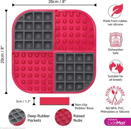 Lickimat Soother Tuff para perros está diseñado para cachorros con dentición y perros traviesos que mastican cualquier cosa, así como para la conveniencia de usar el lavavajillas, y tiene un formato cuadrado de 20cm x 20cm. Su forma de cuadrada que ayuda a combatir el aburrimiento, reducir la ansiedad, comportamientos destructivos y disfrutar una experiencia de alimentación enriquecida al recoger los alimentos incrustados en la superficie texturizada.