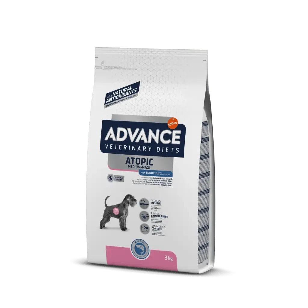 ADVANCE VETERINARY DIETS Atopic Medium/Maxi es un alimento dietético completo y equilibrado para perros medium/maxi, formulado para cuidar de la piel en caso de dermatitis y pérdida de pelo excesiva, así como para reducir de intolerancias a ingredientes y nutrientes.