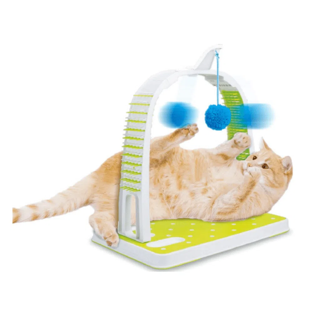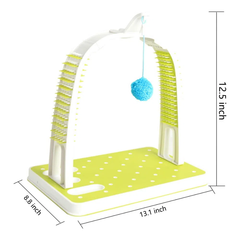 Fabricado con materiales duraderos y una base resistente, garantiza estabilidad durante el uso. Además, incluye una pelota colgante que añade un elemento de juego, manteniendo a tu gato entretenido mientras se acicala.