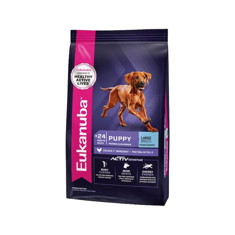 El alimento seco para perros Eukanuba Puppy Large Breed es una nutrición completa y equilibrada para cachorros de razas grandes de hasta 15 meses de edad con un peso adulto esperado de más de 55 libras.