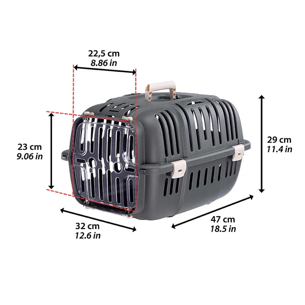 La puerta transparente permite verla en todo momento y cuenta con aberturas de ventilación y cierre seguro. Ligero pero resistente, Jet incluye ganchos de seguridad, asa superior robusta y opción de colocar bandolera para llevarlo al hombro. Su diseño desmontable y compacto facilita el transporte y el almacenamiento. Dimensiones 32 x 47 x h 29 cm. Capacidad Máxima 5 kg