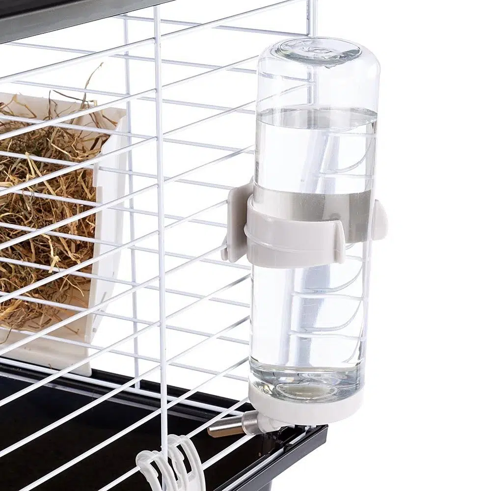 - Accesorios incluidos: 1 bebedero, 1 comedero para heno, 1 cuenco y 1 casa de reposo