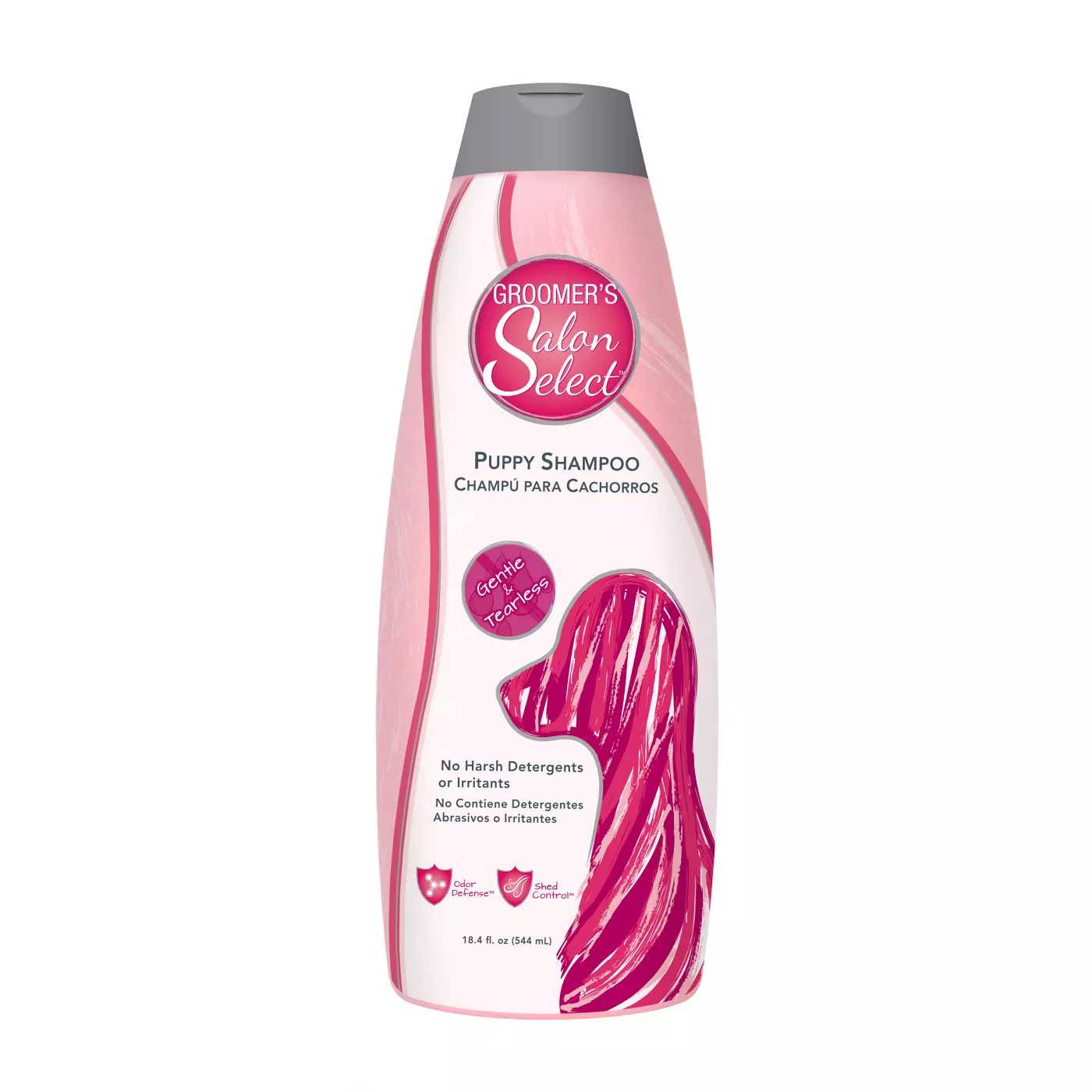 El champú para cachorros Groomer’s Salon Select™ no contiene detergentes agresivos ni irritantes para proteger la piel sensible de su cachorro y tiene el beneficio adicional de ser hipoalergénico y libre de lágrimas.