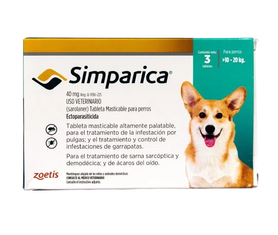 Simparica, es un comprimido palatable para perros, que ofrece una rápida y eficaz acción en el tratamiento y control de pulgas y garrapatas, ayudando a mejorar la calidad de vida de su mascota.