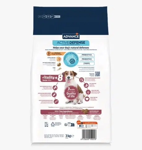 Advance Vitality Senior Medium +7 ayuda a mantener la vitalidad de los perros de tamaño mediano mayores de 7 años. Les aporta 7 beneficios clave para su edad que ayudan a mantener su calidad de vida.