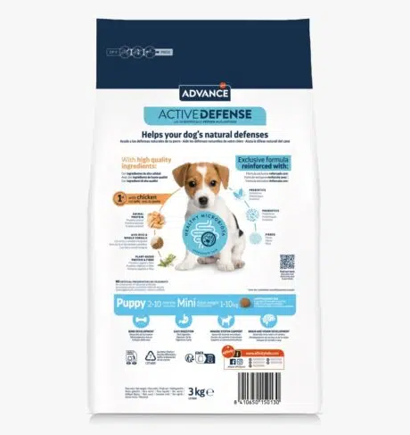 ADVANCE Adult Mini es un alimento de alta gama fácil de digerir formulado para cubrir sus necesidades específicas. Facilita el correcto funcionamiento del sistema inmunitario y las barreras naturales y les ayuda a mantener una masa muscular óptima, la salud dental e intestinal, la piel sana y el pelo brillante. Además, el tamaño de las croquetas de ADVANCE Adult Mini se adapta al tamaño de la mandíbula de tu perro Mini.